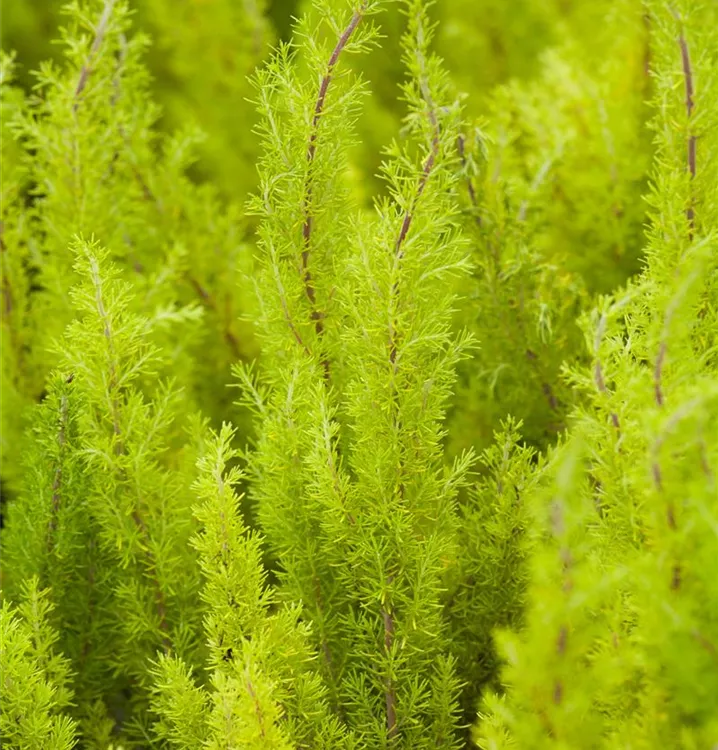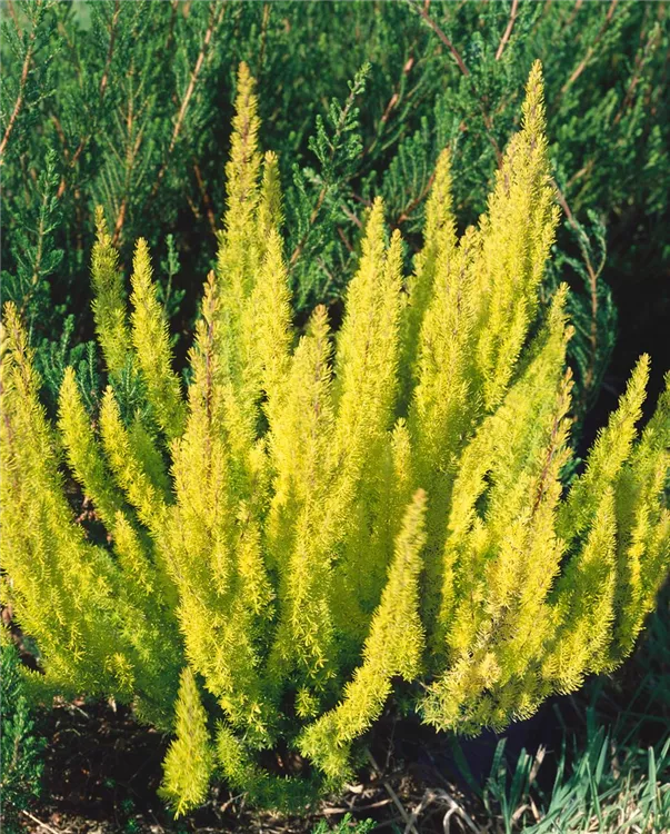 Die immergrünen Blätter der Baumheide sind gelb-grün, nadelförmig.