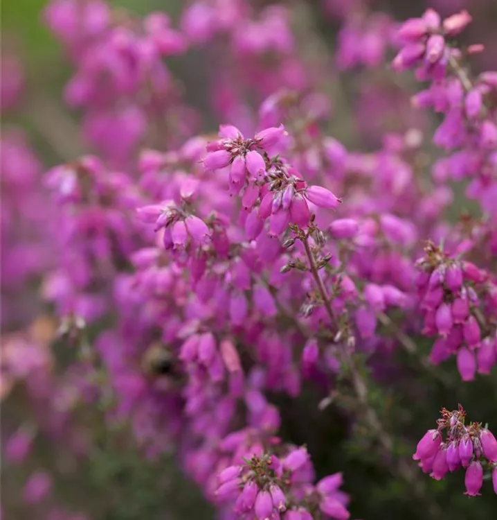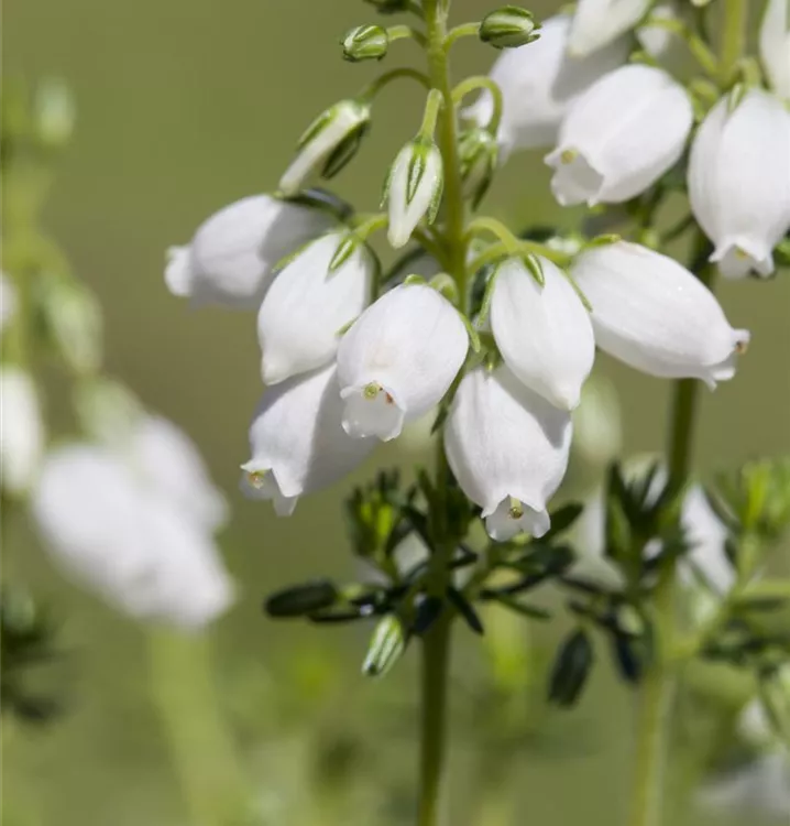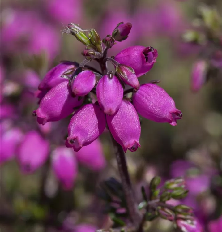 Die purpurvioletten, glockenförmigen Blüten der Grauheide erscheinen in Trauben von Juni bis Juli.