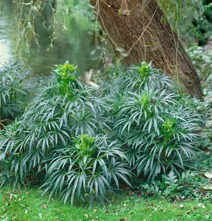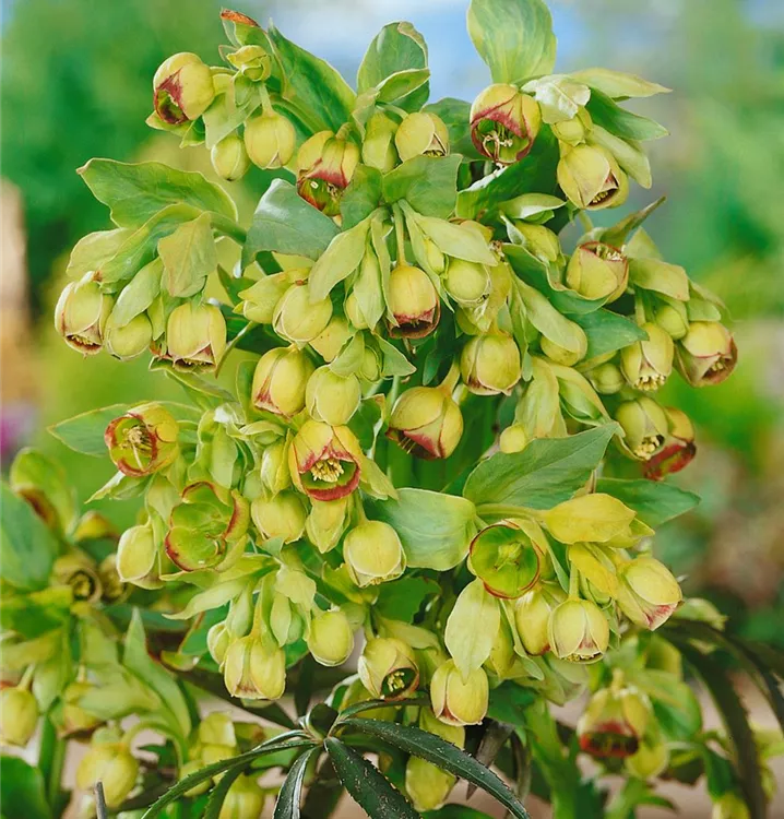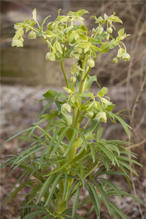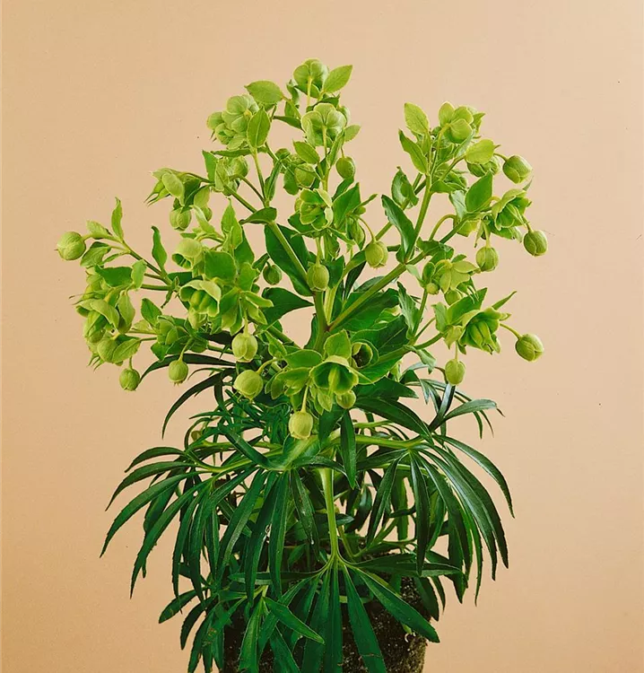 Die Palmblatt-Nieswurz (Helleborus foetidus) ist eine aufrechte immergrüne Staude, die von Februar bis Mai hellgrüne, glockenförmige Blüten bildet. An einem sonnigen bis halbschattigen Standort mit durchlässigem, humosem Boden erreicht sie gewöhnlich eine Höhe von ca. 50 cm und wird ca. 50 cm breit. Die Palmblatt-Nieswurz ist gut frostverträglich.