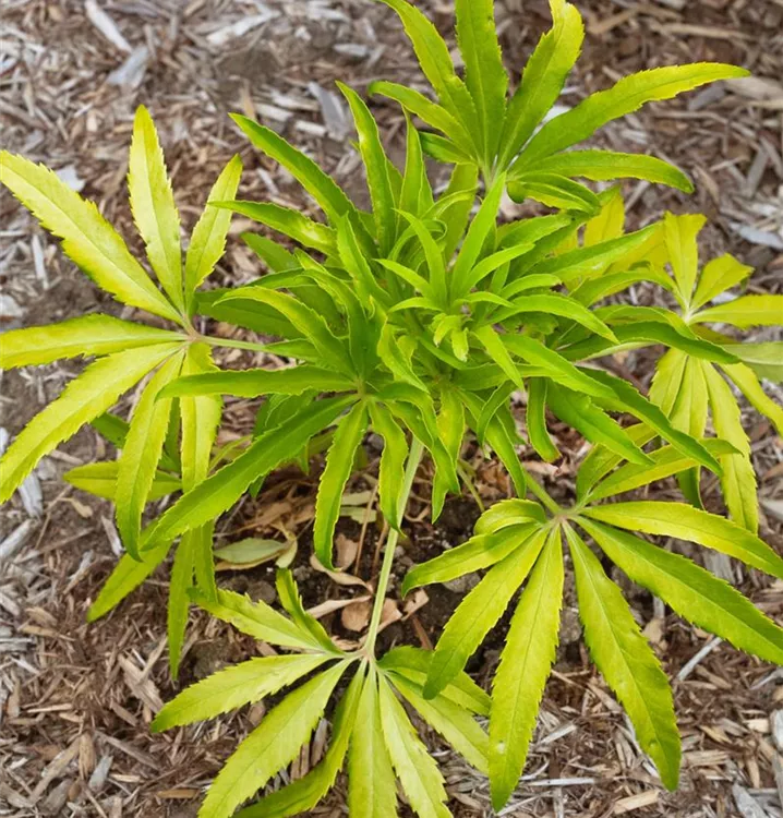 Die immergrünen Blätter der Palmblatt-Nieswurz sind dunkelgrün, gefingert.
