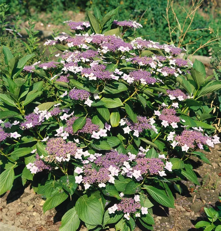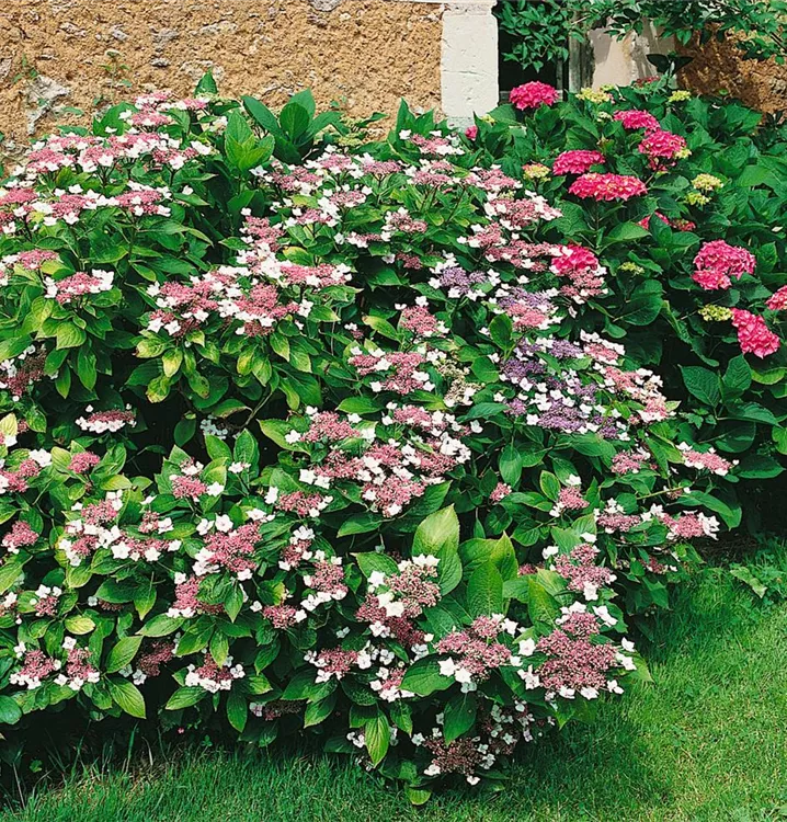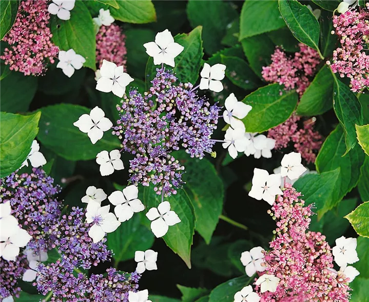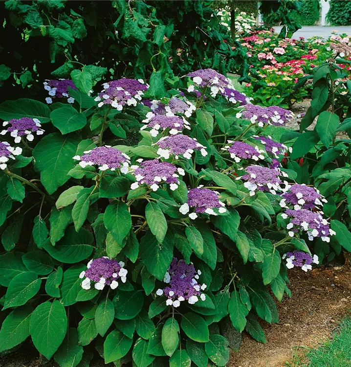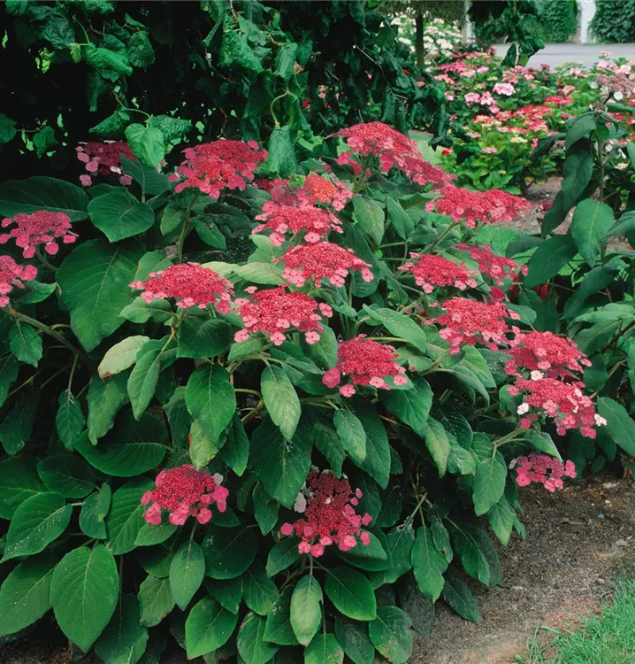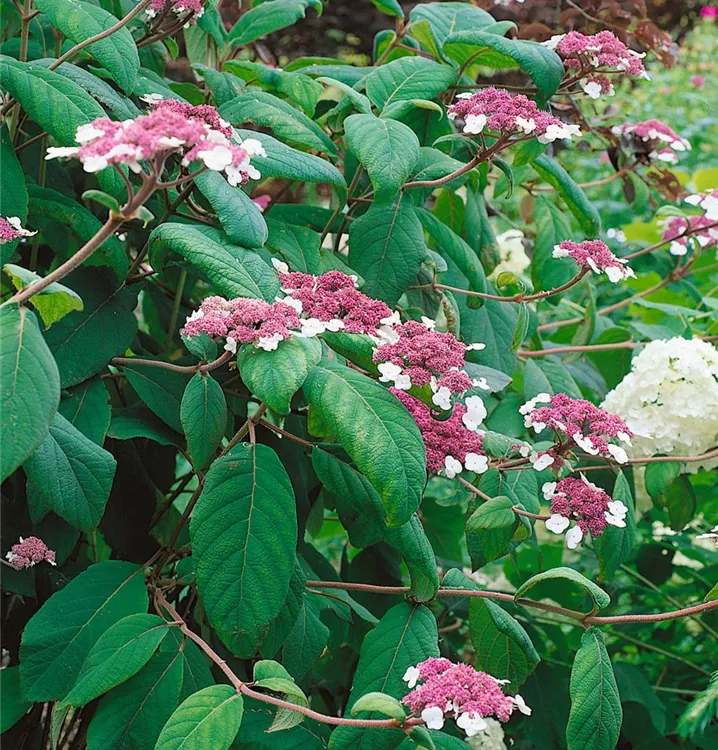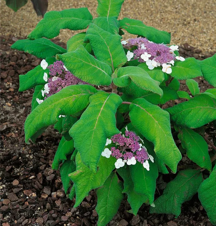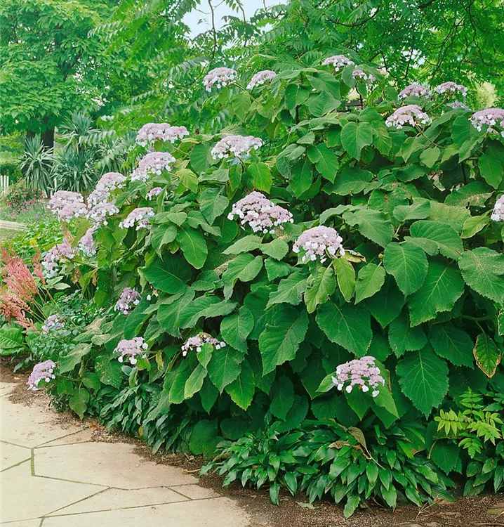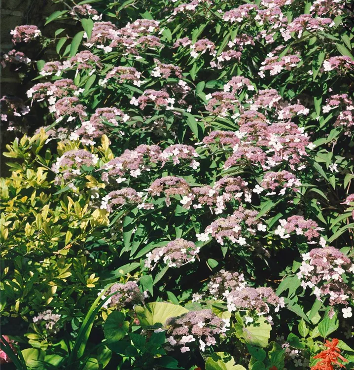 Die Rauhe Hortensie (Hydrangea aspera) ein Strauch, der, je nach Sorte, Blüten in verschiedenen Farben hervorbringt. An einem halbschattigen, windgeschützten Standort mit durchlässigem, humosem Boden erreicht sie gewöhnlich eine Höhe von ca. 2 m und wird ca. 2,5 m breit.