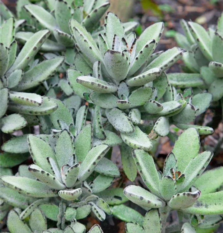 Die Pandapflanze (Kalanchoe tomentosa) ist eine orangegelb blühende Pflanze, die eiförmige, dickfleischige, blau-graue, gesägte Blätter trägt. Ihre becherförmigen Blüten erscheinen von Dezember bis April. Diese rosettenartige und sukkulente Pflanze gedeiht am besten an einem sonnigen bis halbschattigen Standort.