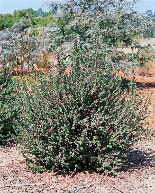 Das Texas-Silberblatt (Leucophyllum frutescens) eine buschige Gartenpflanze, die, je nach Sorte, Blüten in verschiedenen Farben hervorbringt. An einem sonnigen Standort mit durchlässigem, lockerem Boden erreicht es gewöhnlich eine Höhe von ca. 1,5 m und wird ca. 1,5 m breit.
