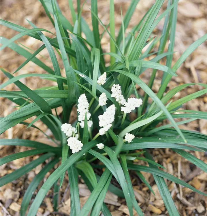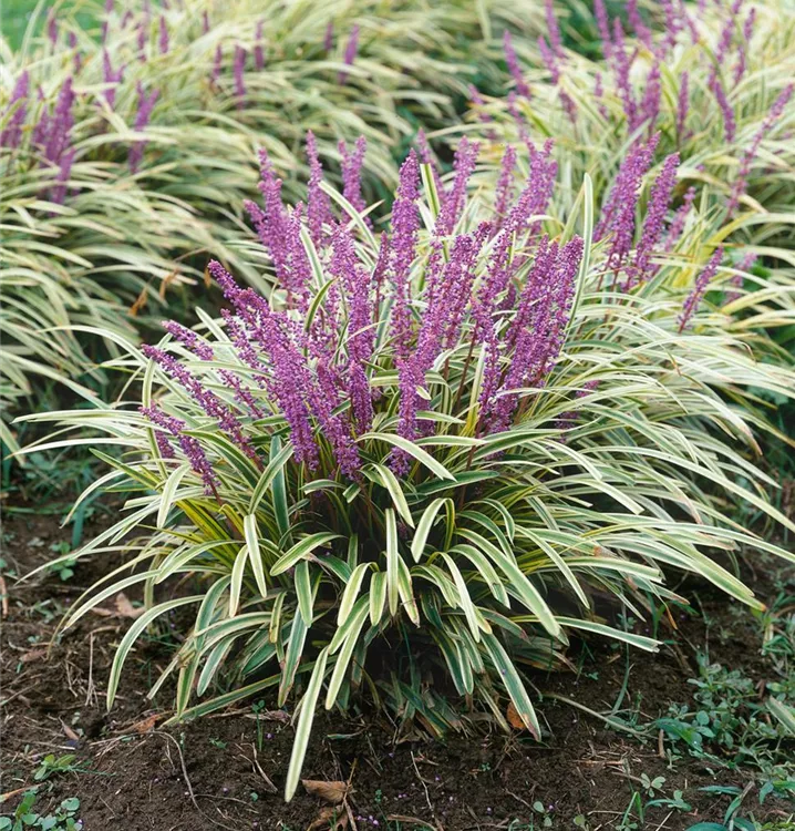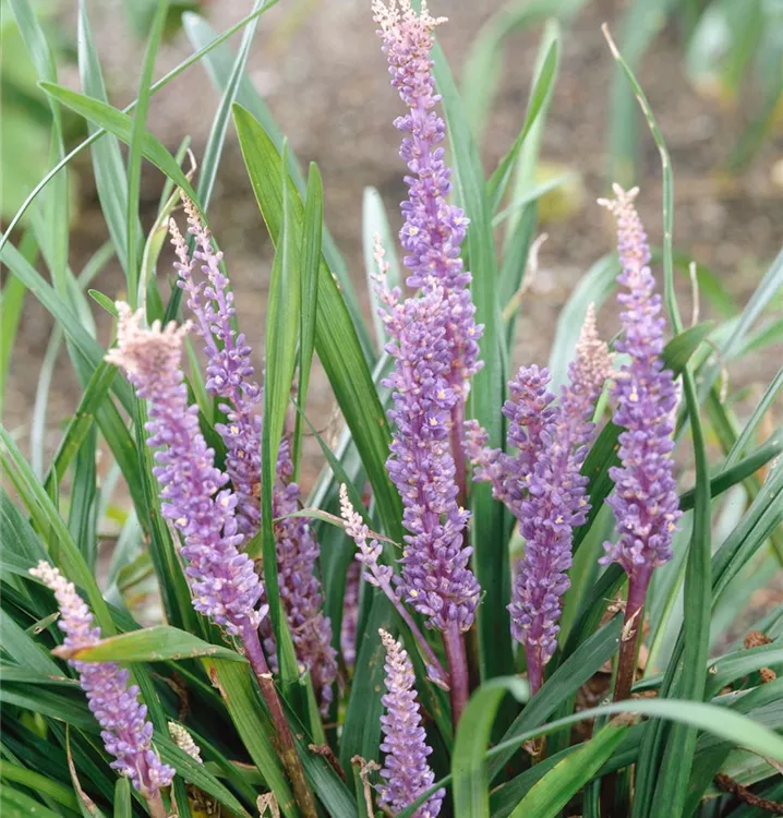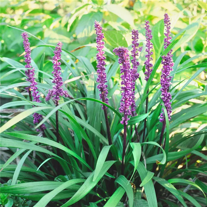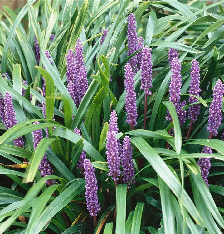 Liriope muscari bildet in Rispen angeordnete, blauviolette Blüten ab August.