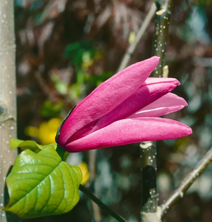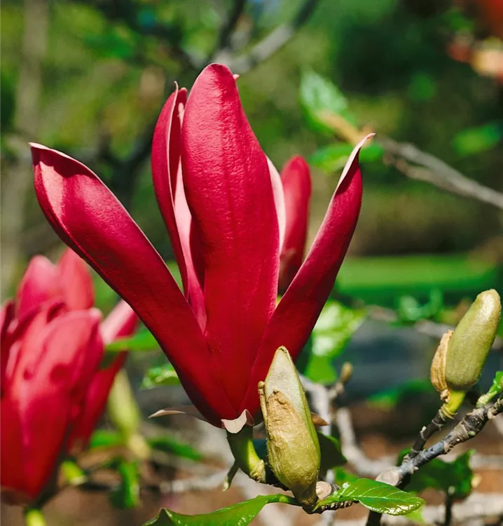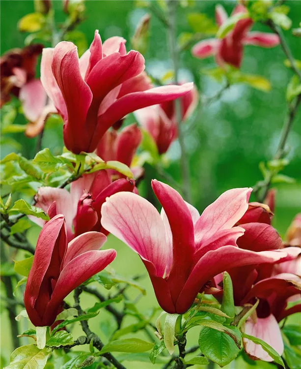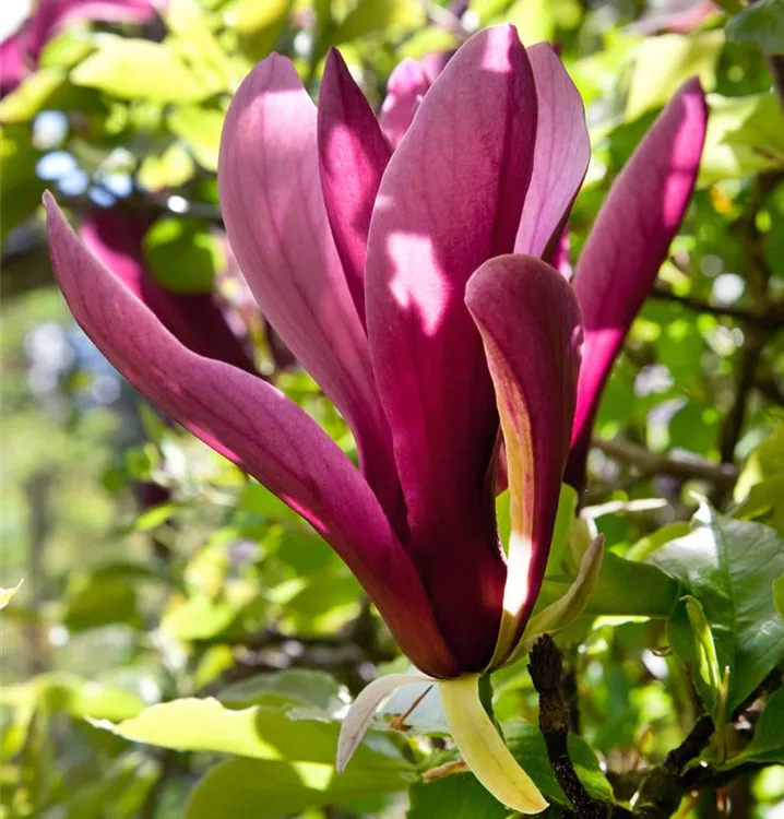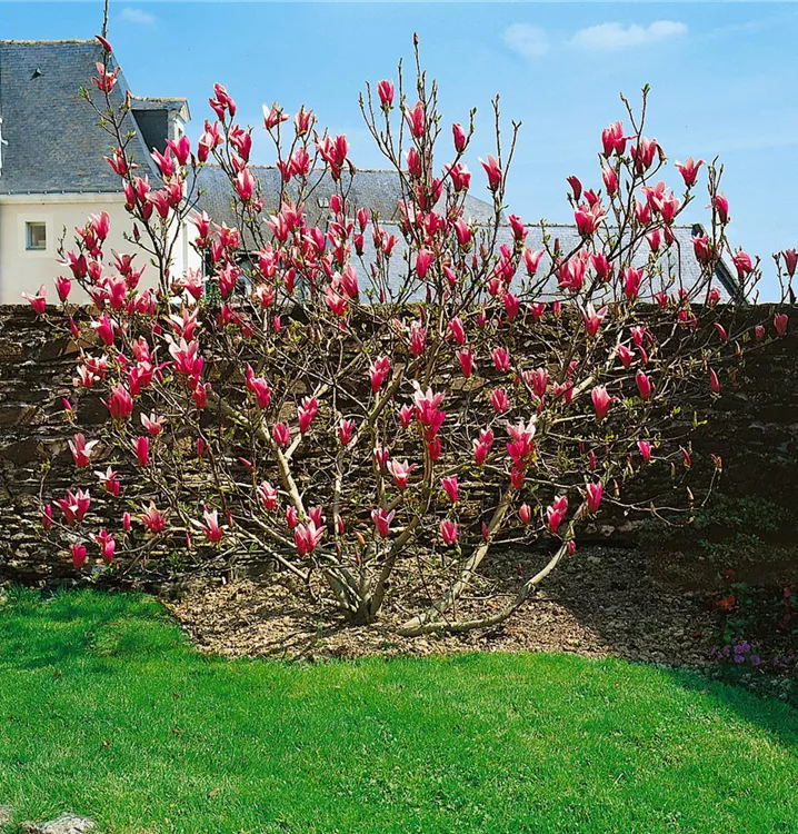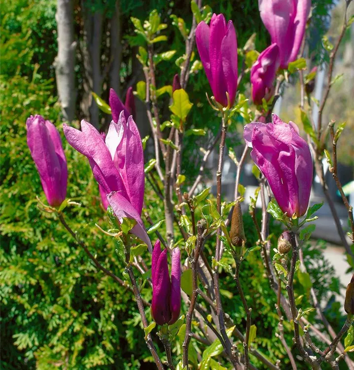 Die Purpurmagnolie (Magnolia liliiflora) ein strauchartiger Großstrauch, der, je nach Sorte, trichterförmige Blüten in verschiedenen Farben hervorbringt. An einem sonnigen bis halbschattigen Standort mit durchlässigem, humosem, nährstoffreichem Boden erreicht sie gewöhnlich eine Höhe von ca. 4 m und wird ca. 3 m breit.