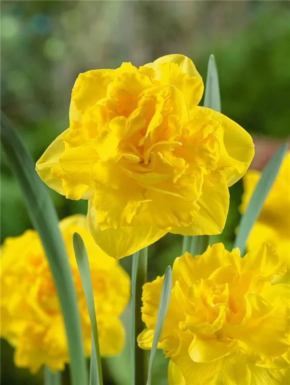 Die gelben, gefüllten, radförmigen oder röhrenförmigen Blüten der Trompeten-Narzisse 'Gold Medal' erscheinen in Trauben im April. Diese sind angenehm duftend.