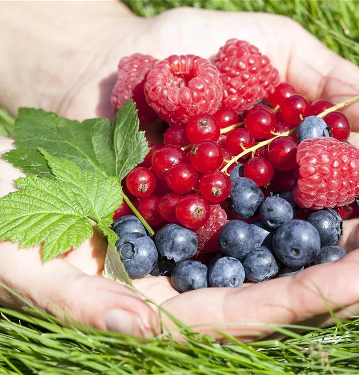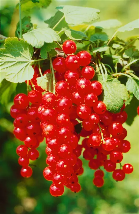 Die roten Beeren haben einen süß-säuerlichen Geschmack. Reifezeit ab Juni.