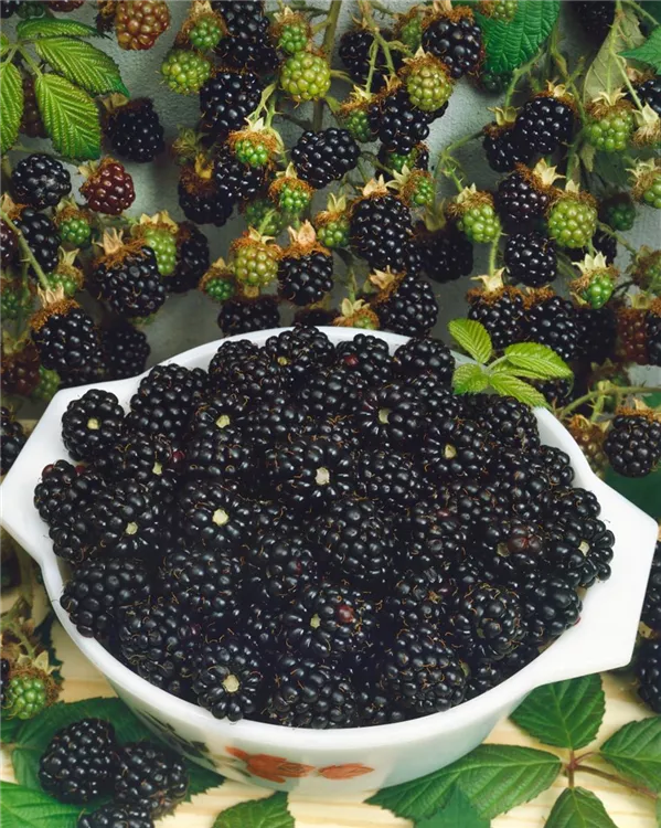 Die Brombeere 'Thornless' (Rubus fruticosus) bildet schwarze Beeren. Diese sind aromatisch, fruchtig im Geschmack. Für eine ertragreiche Ernte ab Ende August schaffen durchlässiger, humoser, nährstoffreicher Boden und ein sonniger bis schattiger Standort optimale Bedingungen. Auch ihre weißen Blüten sind eine schöne Erscheinung.