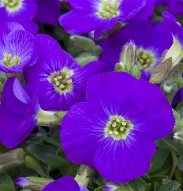 Die sommergrünen Blätter des Blaukissens sind dunkelgrün, lanzettlich.