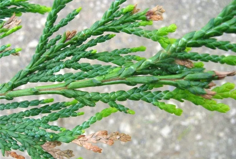Die Triebspitzen von Scheinzypressen (Chamaecyparis) sind braun verfärbt. Bei genauerer Untersuchung kann man feststellen, dass die geschädigten Zweigspitzen innen hohl gefressen und mit schwarzen Kotkrümelchen gefüllt sind.
