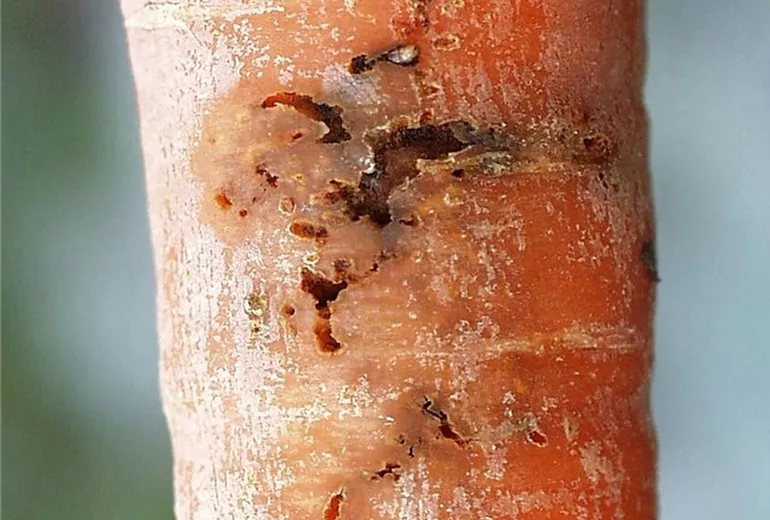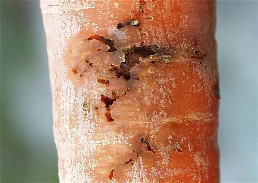 In den Rüben der Möhre befinden sich rostbraun gefärbte Fraßgänge, in denen oftmals die Larven (Maden) der Möhrenfliege zu finden sind. Die Möhren haben einen unangenehmen Beigeschmack.