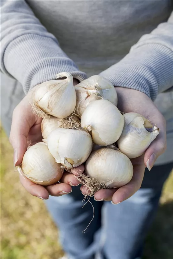 Die Zwiebeln werden in Horsten, also in kleinen Gruppen, gepflanzt. Dabei halten Sie einen Abstand von 5 bis 20 Zentimetern ein – je nach Größe der Blumenzwiebel. Die Spitze der Blumenzwiebel muss nach oben zeigt zeigen. Das Pflanzloch graben Sie etwa zwei- bis dreimal so tief, wie die Zwiebel hoch ist. Die Tiefe ist besonders bei Pflanzen mit schweren Blüten relevant, weil sie andernfalls nicht genügend Halt bekommen und abknicken. Direkt nach dem Einsetzen drücken Sie die Erde an und gießen die Zwiebeln. Bei Trockenheit wird weiterhin regelmäßig gegossen. Übertreiben Sie es aber nicht: Nasse Füße durch Staunässe gefallen keiner Pflanze.