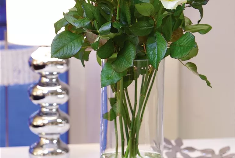Bevor Sie Blumen in einer Vase dekorieren, haben die Stängel einen frischen Anschnitt mit einem scharfen Messer nötig. Erschlaffen die Blüten mit der Zeit und verlieren die Stängel an Festigkeit lohnt ein erneuter Anschnitt – auch mehrmals. Die Wasseraufnahme verbessert sich somit, da die eingetrockneten Enden und möglicherweise verstopften, unteren Teile der Leitungsbahnen entfernt und von Bakterien und schmutzigen Ablagerungen befreit werden. Wechseln Sie dabei das Wasser in der Vase, und das Blühen dauert noch lange an.