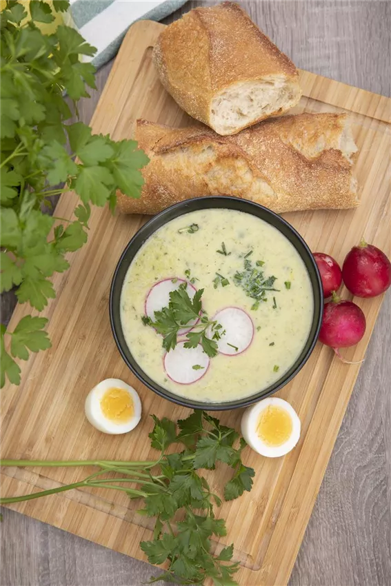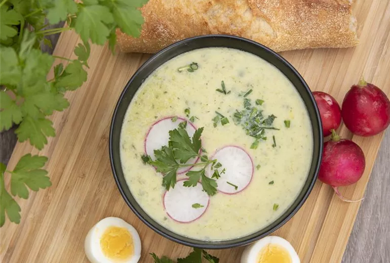 Die Eier pellen und halbieren. Die Suppe kann dann mit übrigen Kräutern, Radieschenscheiben und den Eihälften angerichtet werden.