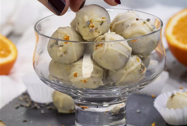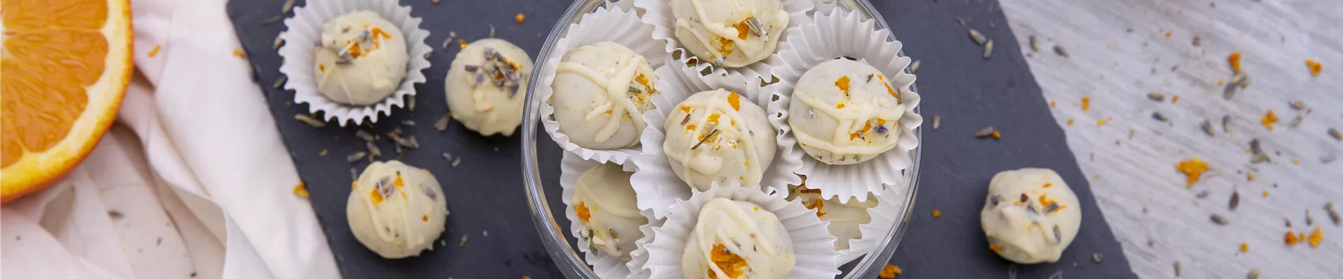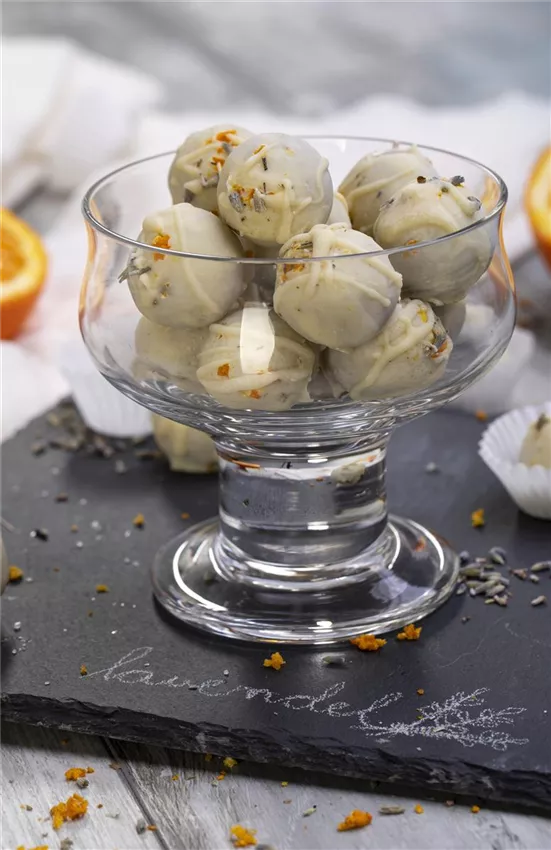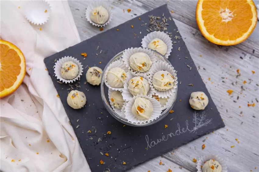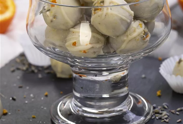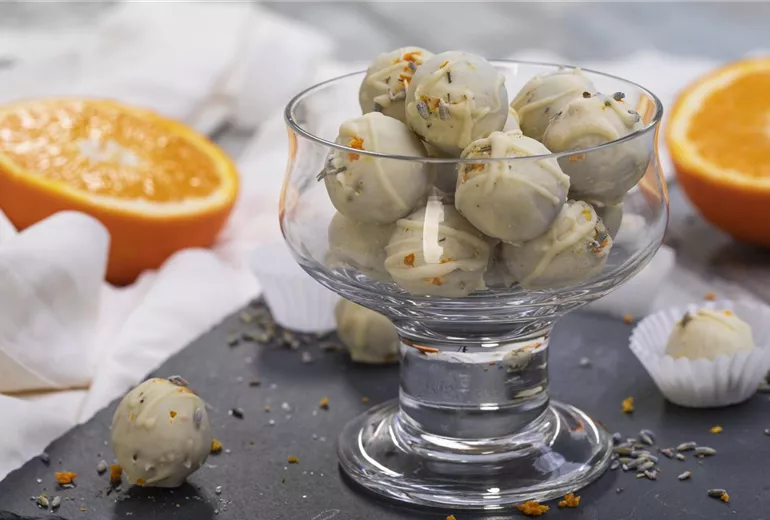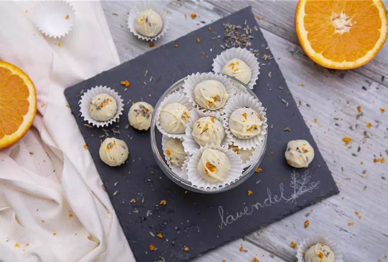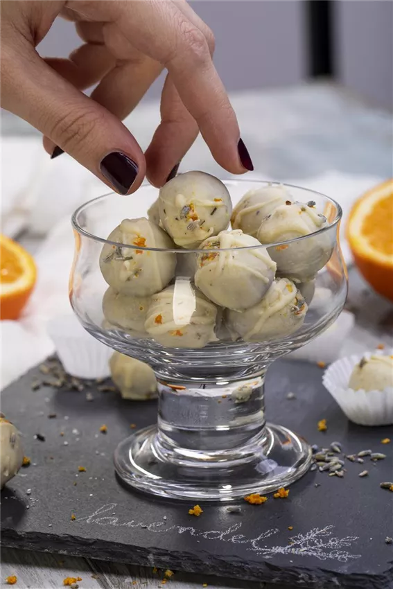 Die restliche Orangenschale zusammen mit den Lavendelblüten fein hacken und direkt auf den noch cremigen Pralinen verteilen. Die Pralinen anschließend für mindestens zwei Stunden kalt stellen.